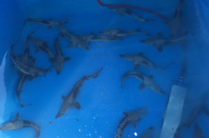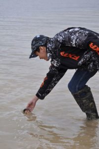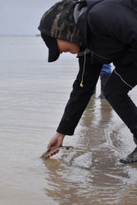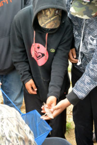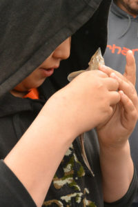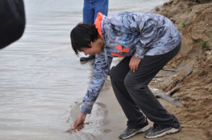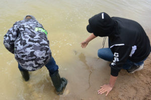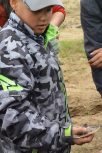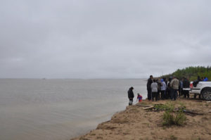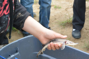 On June 15, 2017, the KSNC hosted a Lake Sturgeon stocking event at the Butnau marina, outside of Gillam MB. Approximately 30 youth, elders and community members from Fox Lake Cree Nation, Tataskweyak Cree Nation and War Lake First Nation gathered to release Lake Sturgeon yearlings (originating from Birthday Rapids brood stock and reared at the Grand Rapids Fish Hatchery) back into the Nelson River. The intent of the event was to engage community members in sturgeon stewardship activities, and build awareness of the KSNC. Participants had an opportunity to look at and hold the fish, ask questions of KSNC committee members, and complete Lake Sturgeon educational activity booklets. After the release, participants gathered back in town for refreshments, presentation on the KSNC and discussion.