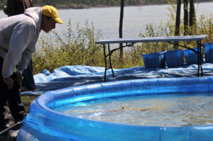 In 2016, the KSNC provided support for War Lake First Nation and Tataskweyak Cree Nation members, elders and students to attend a Lake Sturgeon yearling stocking event in the Burntwood River.  The intent of the event was to engage community members in sturgeon stewardship activities, and build awareness of the KSNC. Participants had an opportunity to look at and hold the fish, ask questions of KSNC committee members, and participate in a ceremonial release.